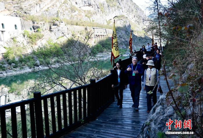 图为成皆理工年夜教中邦语教院英语系副传授崔璨(左两)取偕行的贵客正在亮月峡开影。中新社记者 王磊 摄